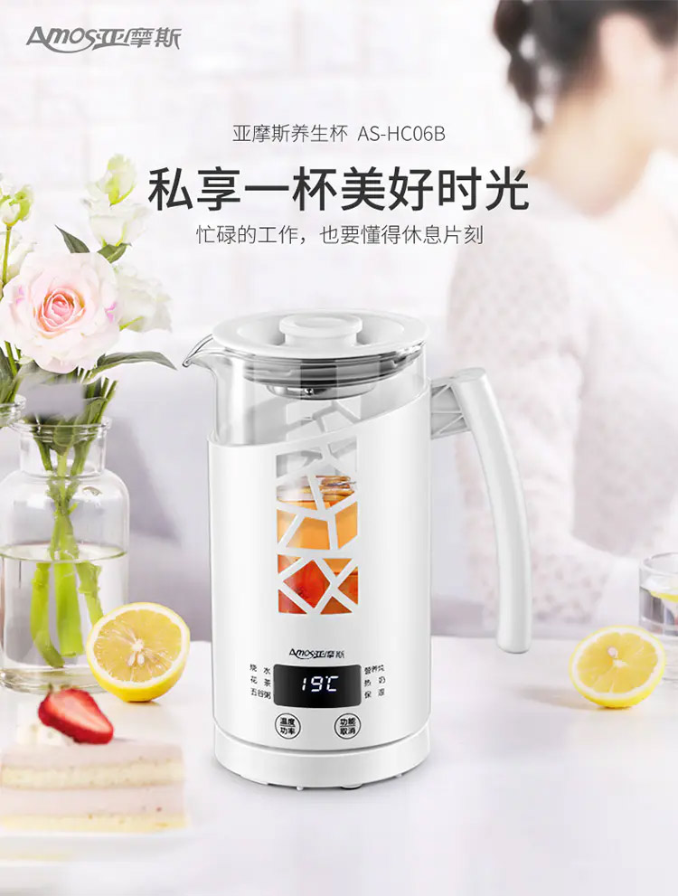 亚摩斯(AMOS) 养生杯 AS-HC06B 镂空壶身 养生壶烧水、煮茶、咖啡、炖煮,样样精通(玻璃养生杯) 1、电脑触屏控制2、镂空壶身外观3、盖中盖设计,可随意增加滤网4、烧水、煮茶、咖啡、炖煮,样样精通5、额定功率:650W;额定容量:0.6